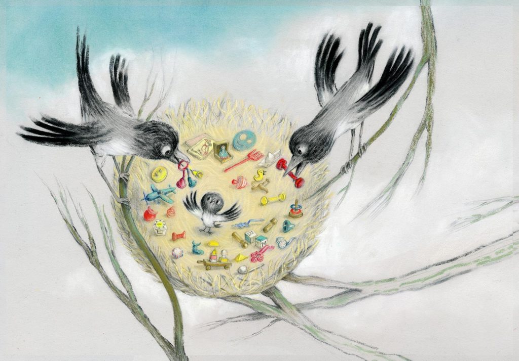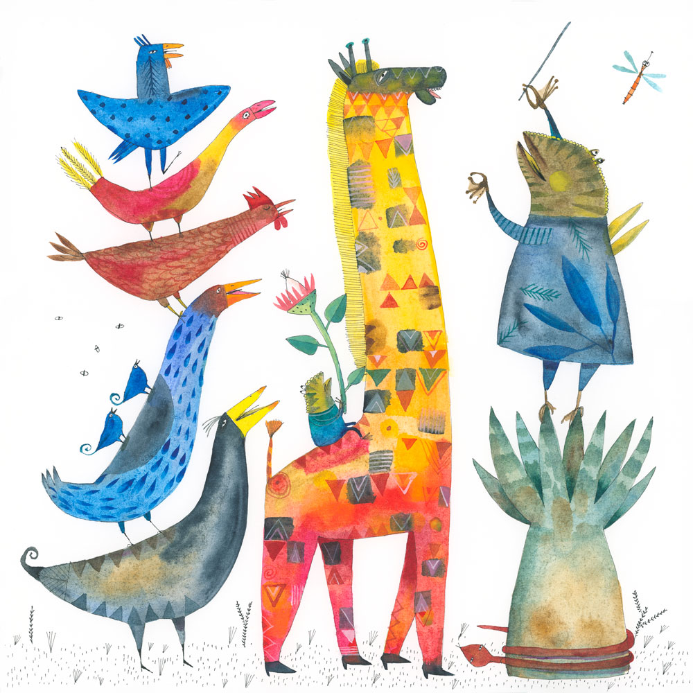 “Queste immagini multilingue ci mostrano il legante meraviglioso dell’illustrazione, cioè l’estetica: frammenti di carta, monotipi, graffito, matita, tutto serve per costruire un insieme: strati visivi che il lettore, nel privilegio della lettura, percepisce come metafore. Queste illustrazioni ci permettono di esplorare l’intenzione giocosa della creazione e della lettura delle immagini. In un mondo dove le divisioni sembrano sempre più evidenti, questo assemblaggio ci ricorda che l’unità può essere trovata anche nella diversità”.