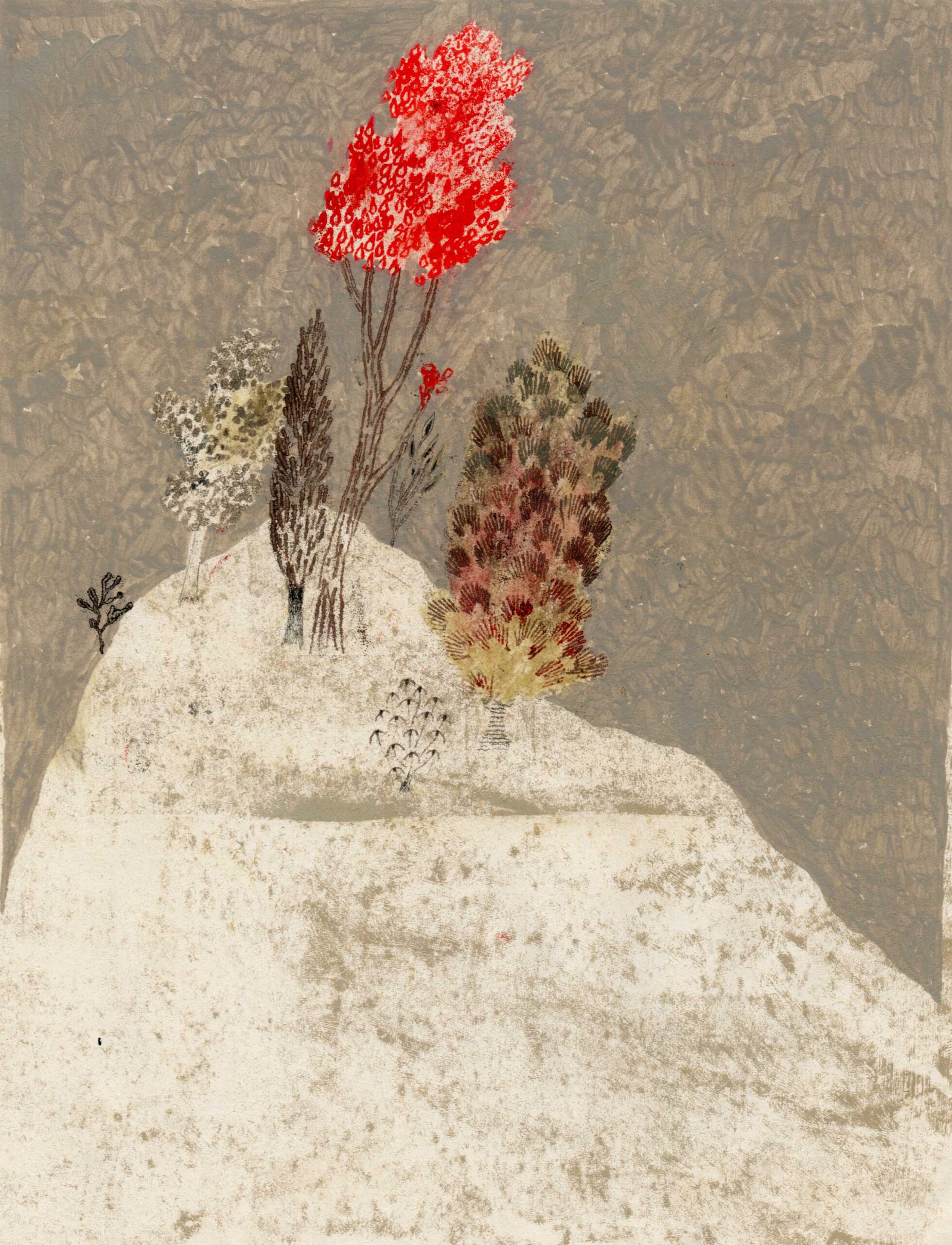 Una piccola anticipazione delle opere esposte, a partire dal libro “Llama de amor viva”, un’antologia di poesia sacra, in cui la Natura ha il ruolo da protagonista e di volta in volta si manifesta nel seme, nel fiore, nell’albero, nella foresta. “Paesaggio con albero rosso”, immagine della mostra, proviene proprio da questo libro pubblicato nel 2013.